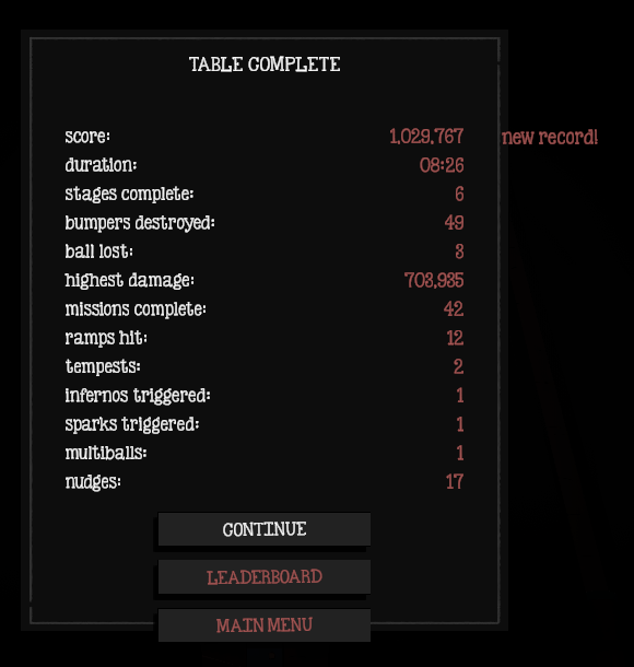 I only played one table, got to act IV in my first try! It's pretty fun, but I'm pretty bad at pinball games and once the middle protective bumper is gone, I died pretty fast. Maybe you can make it easier for beginners? Maybe made a difficulty option or some options that you can toggle for harder mode but get more points, like in Hades?