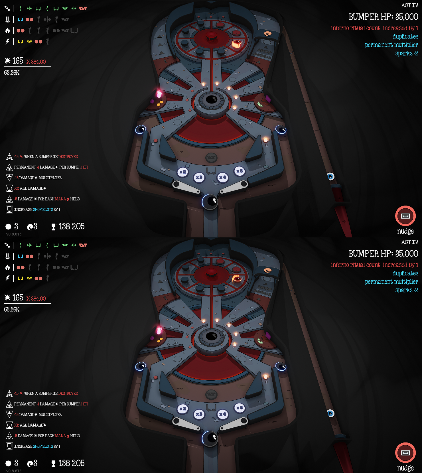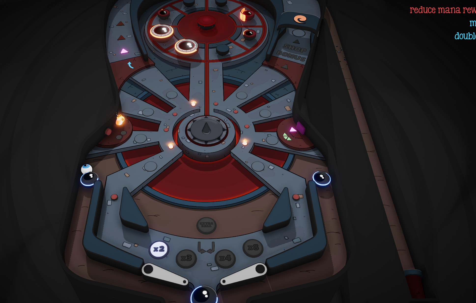 There's some potential for a couple cool temporary damage boosts from Glyphs in return for doing risky things. E.g. remove side blockers and gain temporary bonus damage after a ball enters a side funnel, while holding one or both flippers open, or while the centre protective blocker is gone.